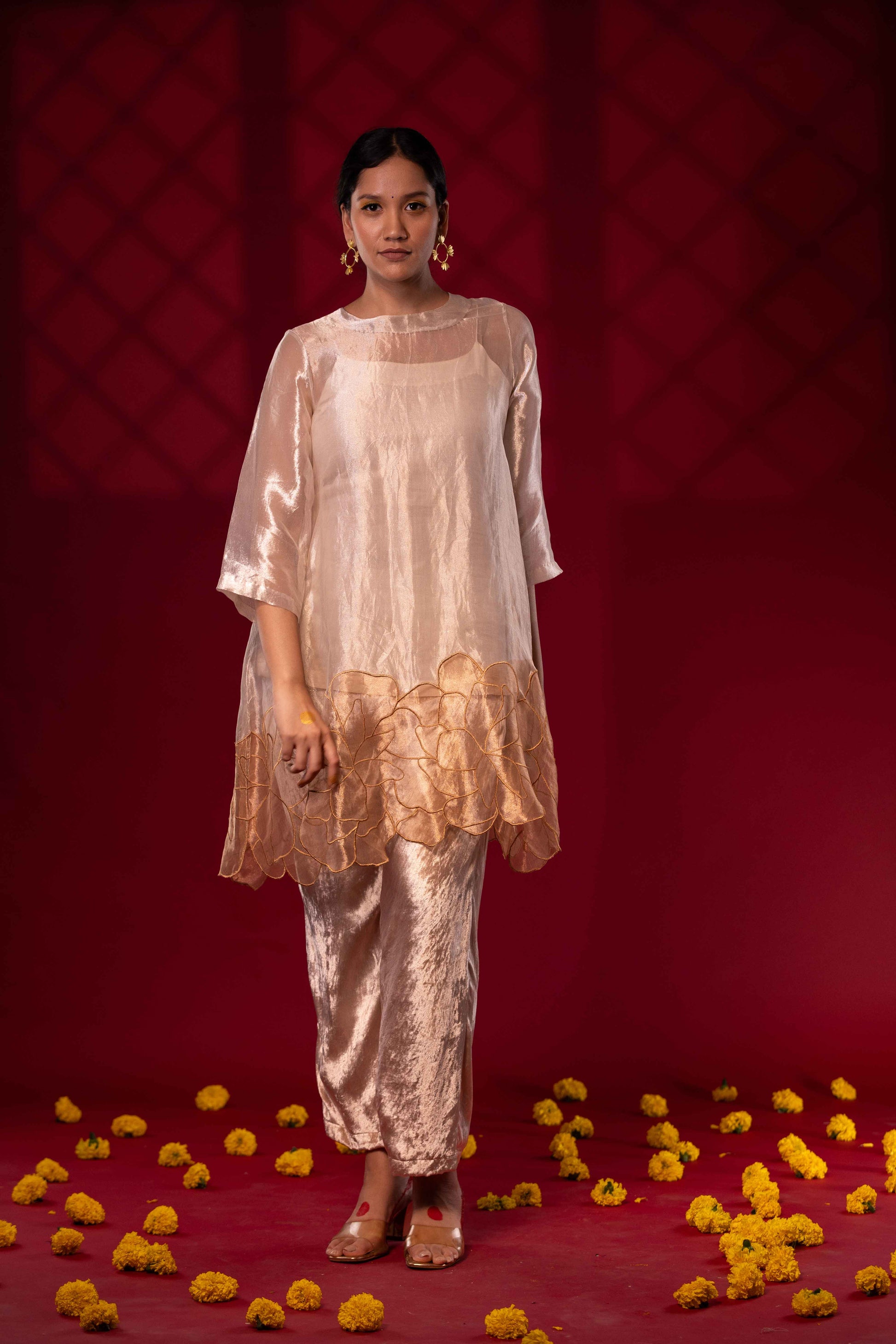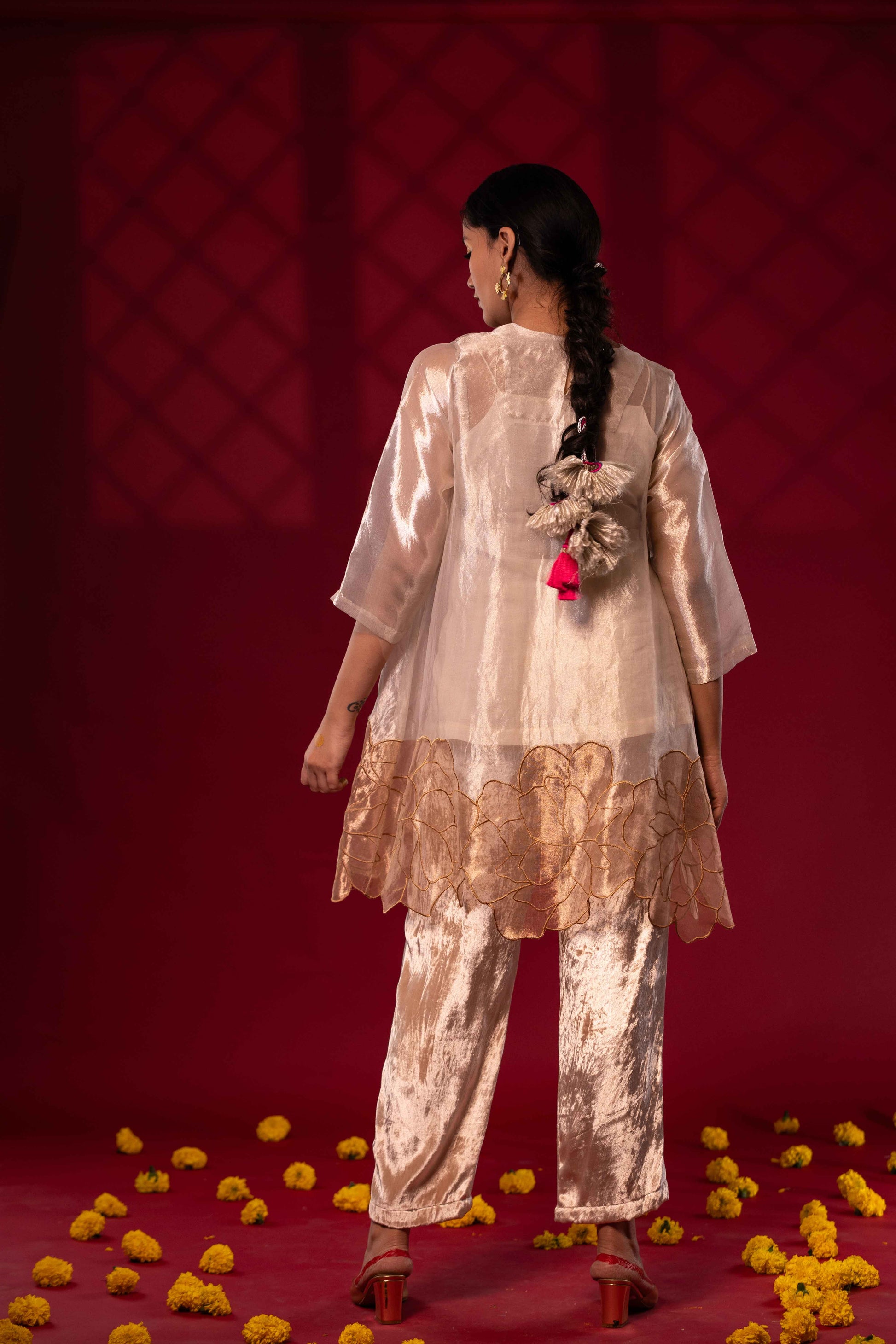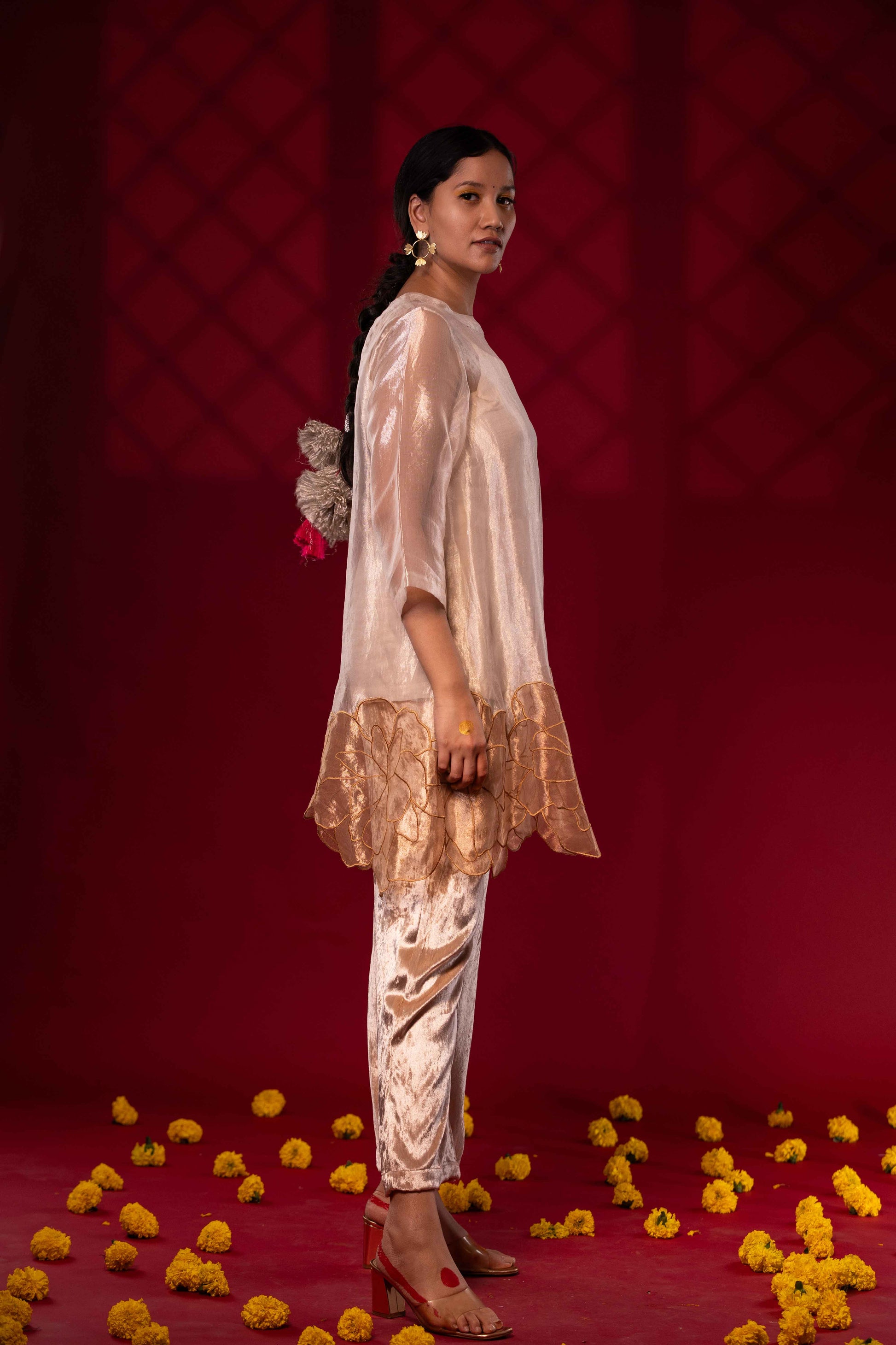 Each garment in this collection is a masterpiece, showcasing the rich heritage of Banaras Tissue Fabric through intricate weaves and luxurious textures collection features a range of silhouettes, from elegant contemporary sarees adorned with delicate coral motifs to exquisite Kaftaans embellished with intricate zari work. Each piece in the collection is designed to make a statement while ensuring comfort and ease of movement, allowing you to celebrate in style without compromising on comfort. Whether you choose to adorn yourself in a resplendent saree or opt for a contemporary fusion, this collection offers versatility and elegance for every occasion.