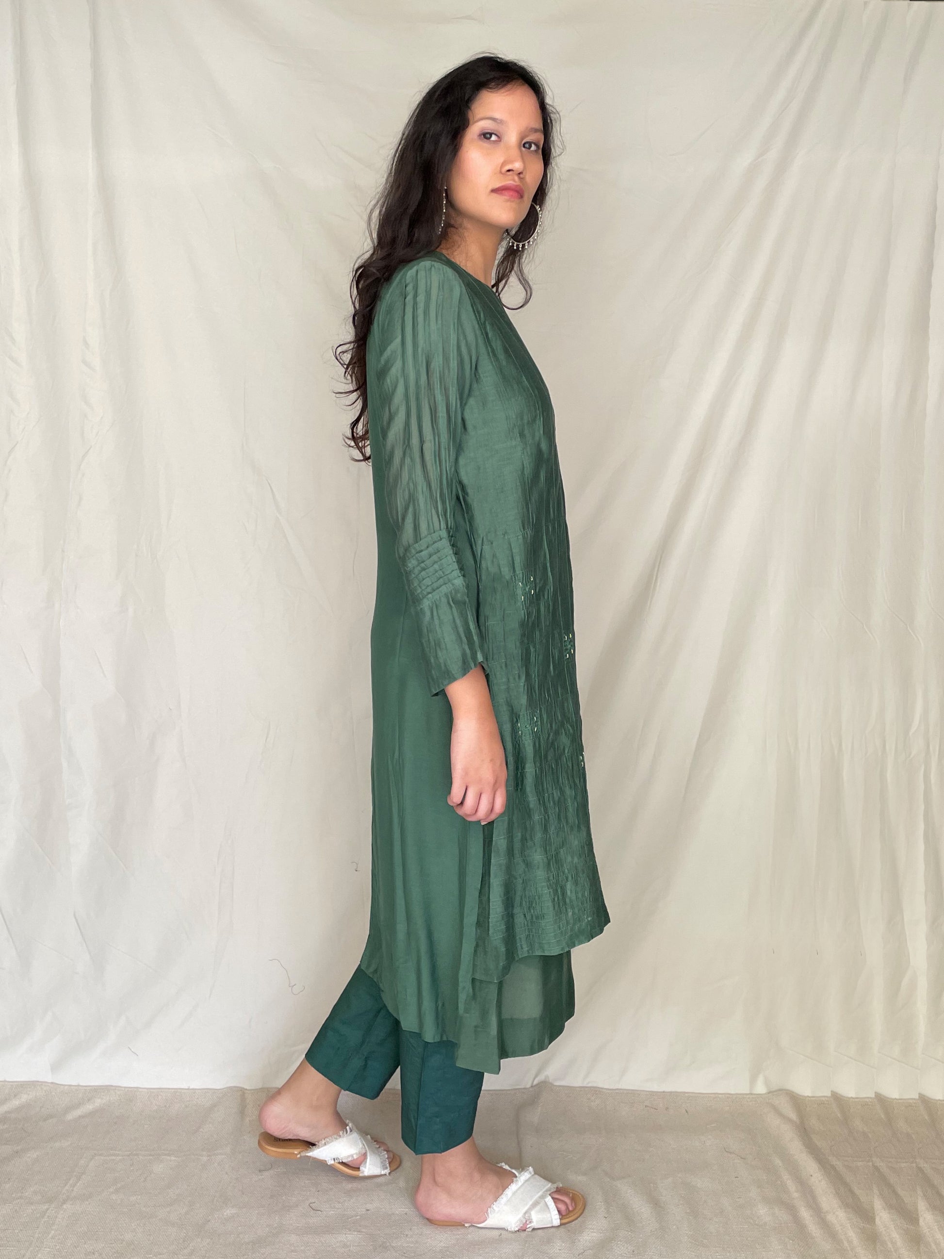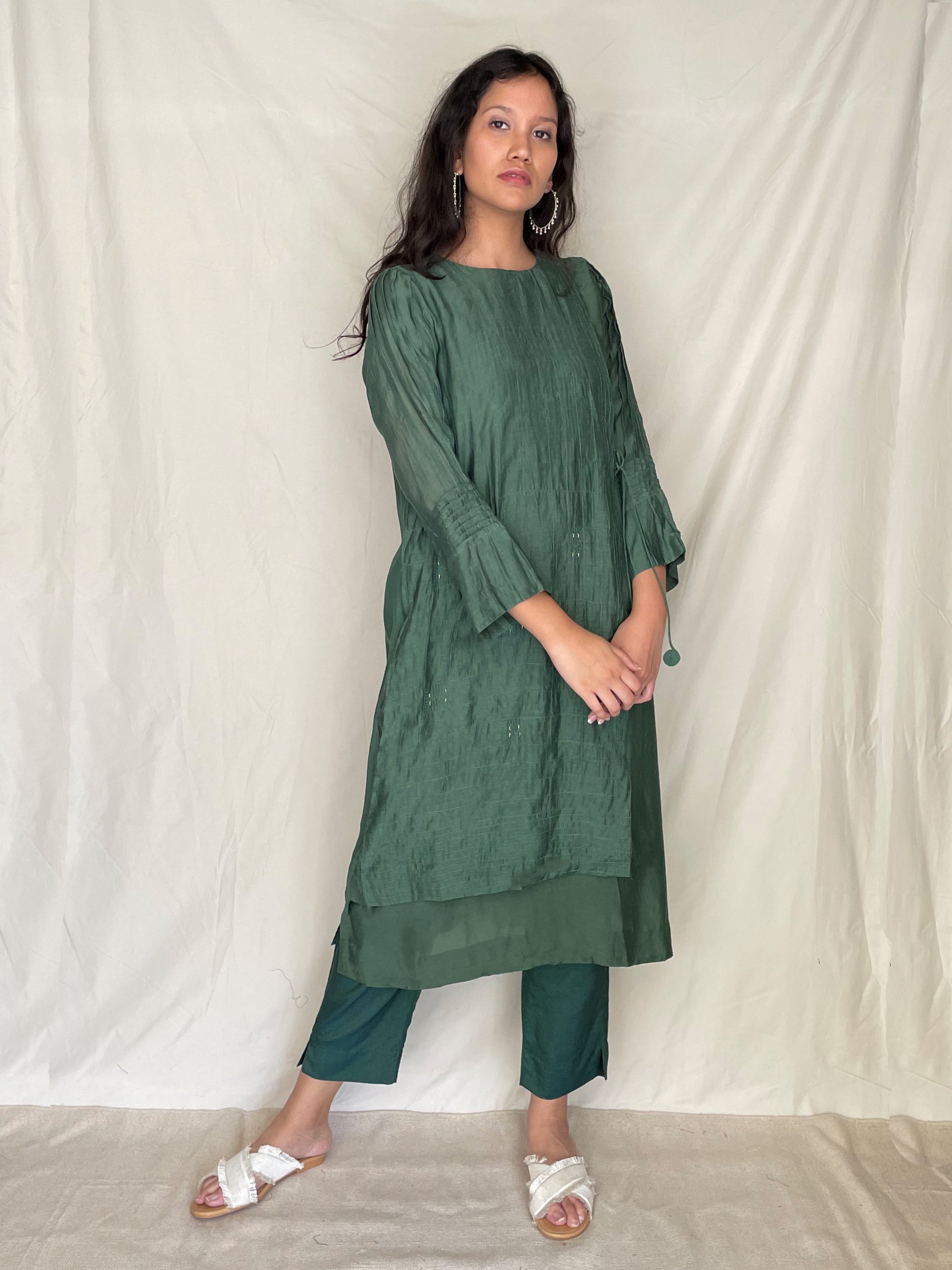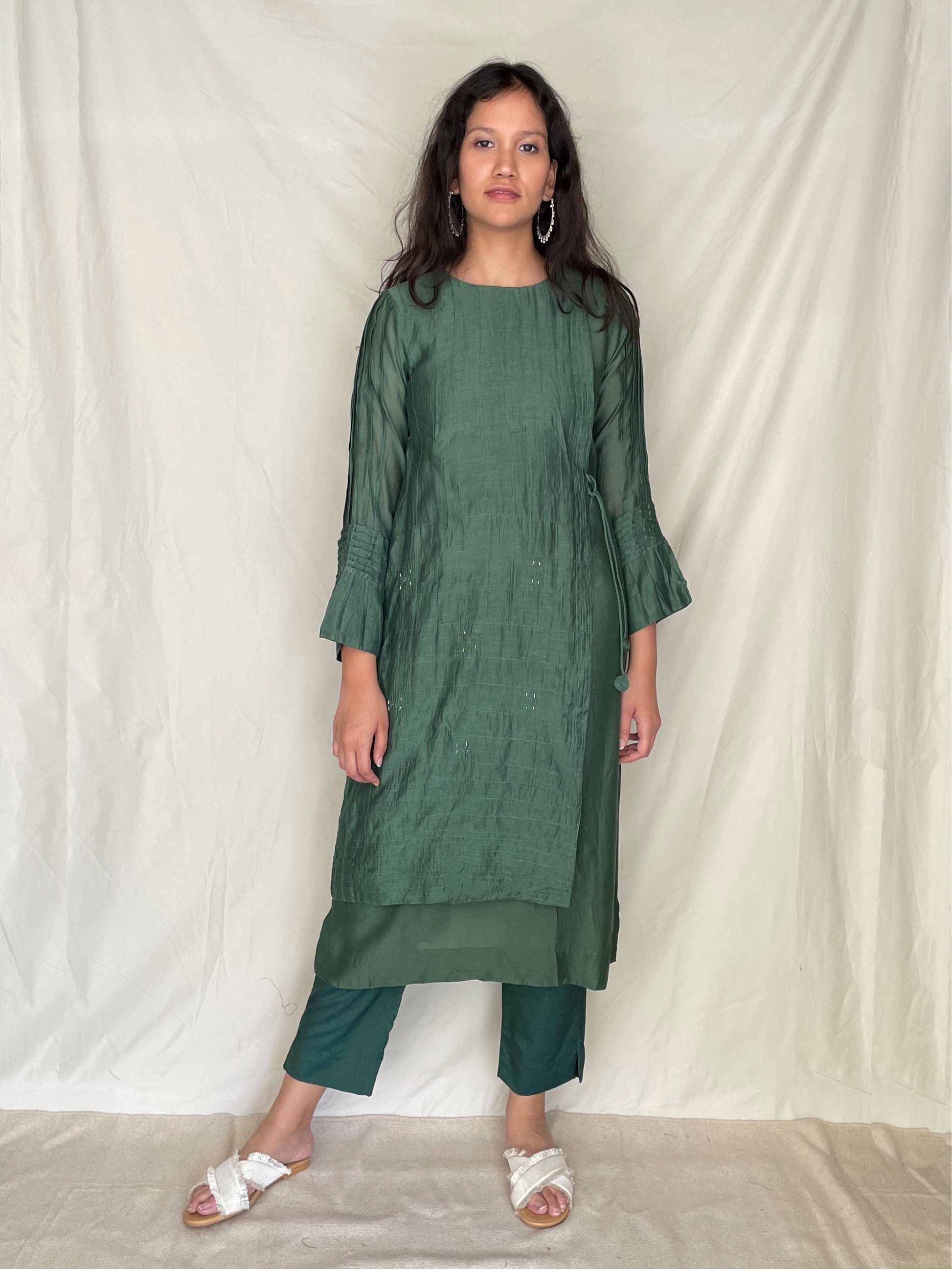 This collection is made of plant-based silk organza, vegan silk, slub chanderi, the beautiful chanderi tissue, and along with it, we have incorporated zari stripes and checks in our collection. The vibrant colours that fall in hues of white, lavender, maroon, reds, yellows and greens, bring out the intricate detailing that is adorned in the collection. The silhouettes are versatile, functional, and comfortable resulting in a playful collection of easy formal wear, with a tinge of minimal aesthetic and unique styles.